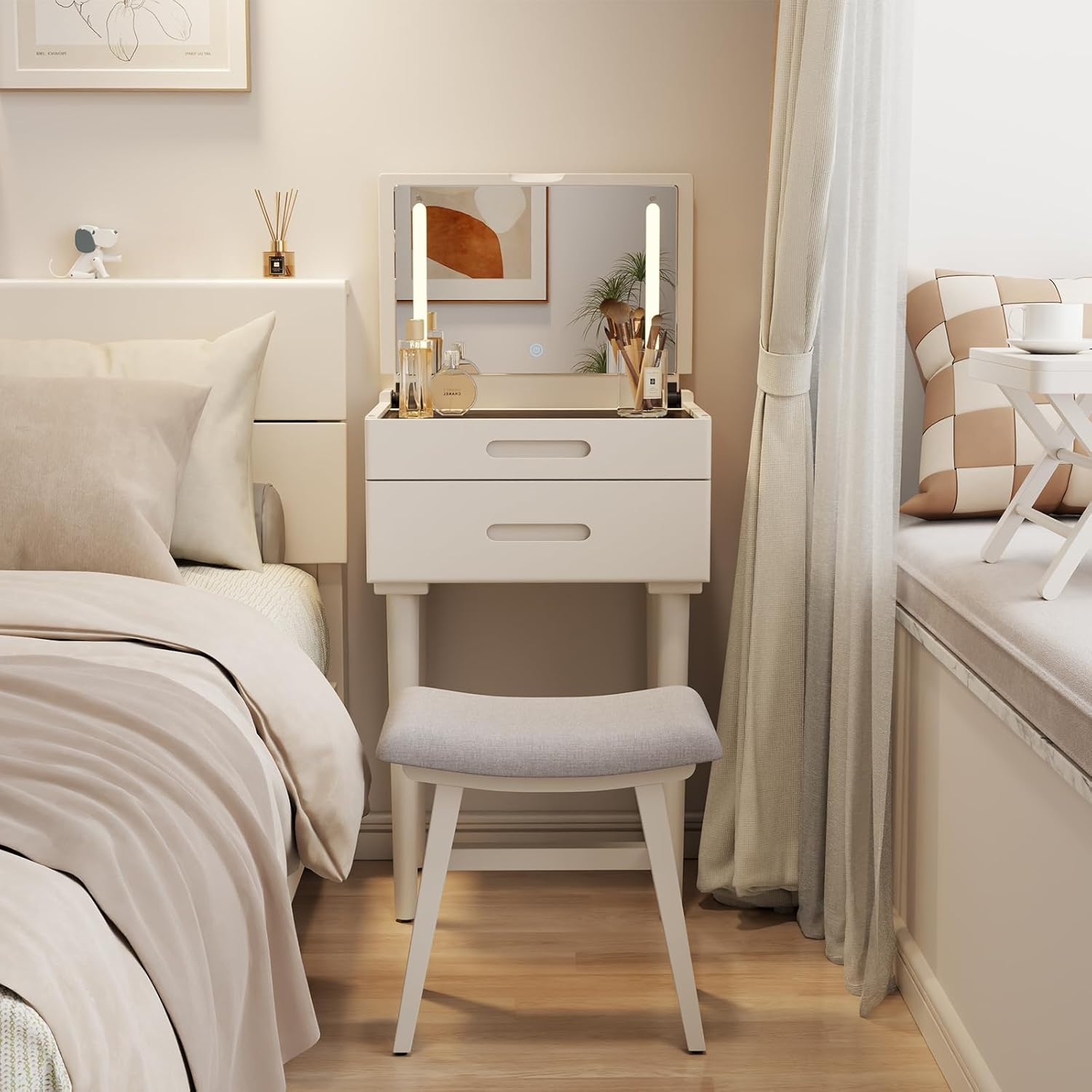 Solid Wood Small Vanity Desk with Flip Top Mirror, Brightness Adjustable Lights, Compact Vanity with Glass Top and Drawers, Slim Dressing Table for Small Space, Bedroom, Living Room, White
